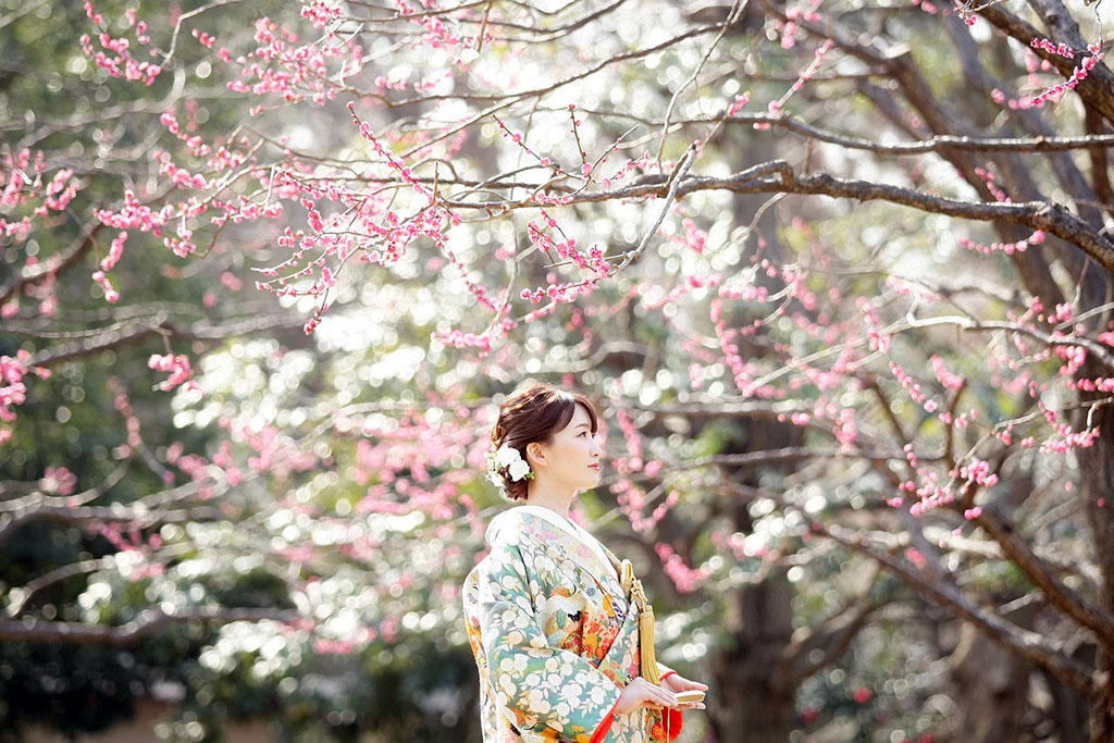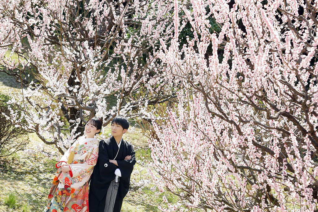 新春の引き締まった空気に光を受けた紅白梅がきらきらと、おふたりの写真を彩ります。