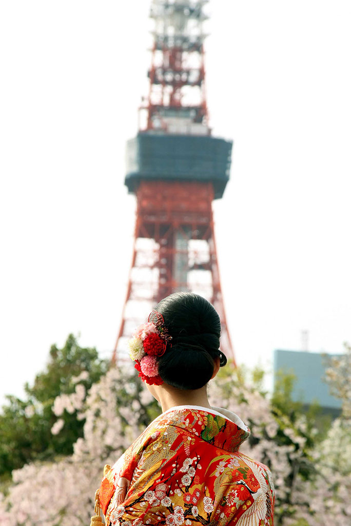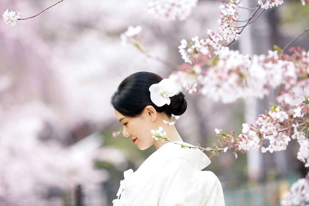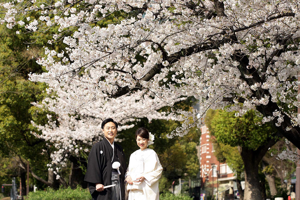都に残る江戸の背景と透き通る様に広がる陽光が桜とふたりを際立てる