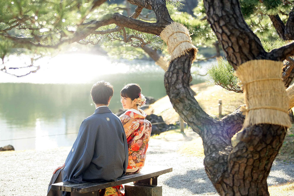 悠久の時を過ごしてきた松と、これからのふたりが写る